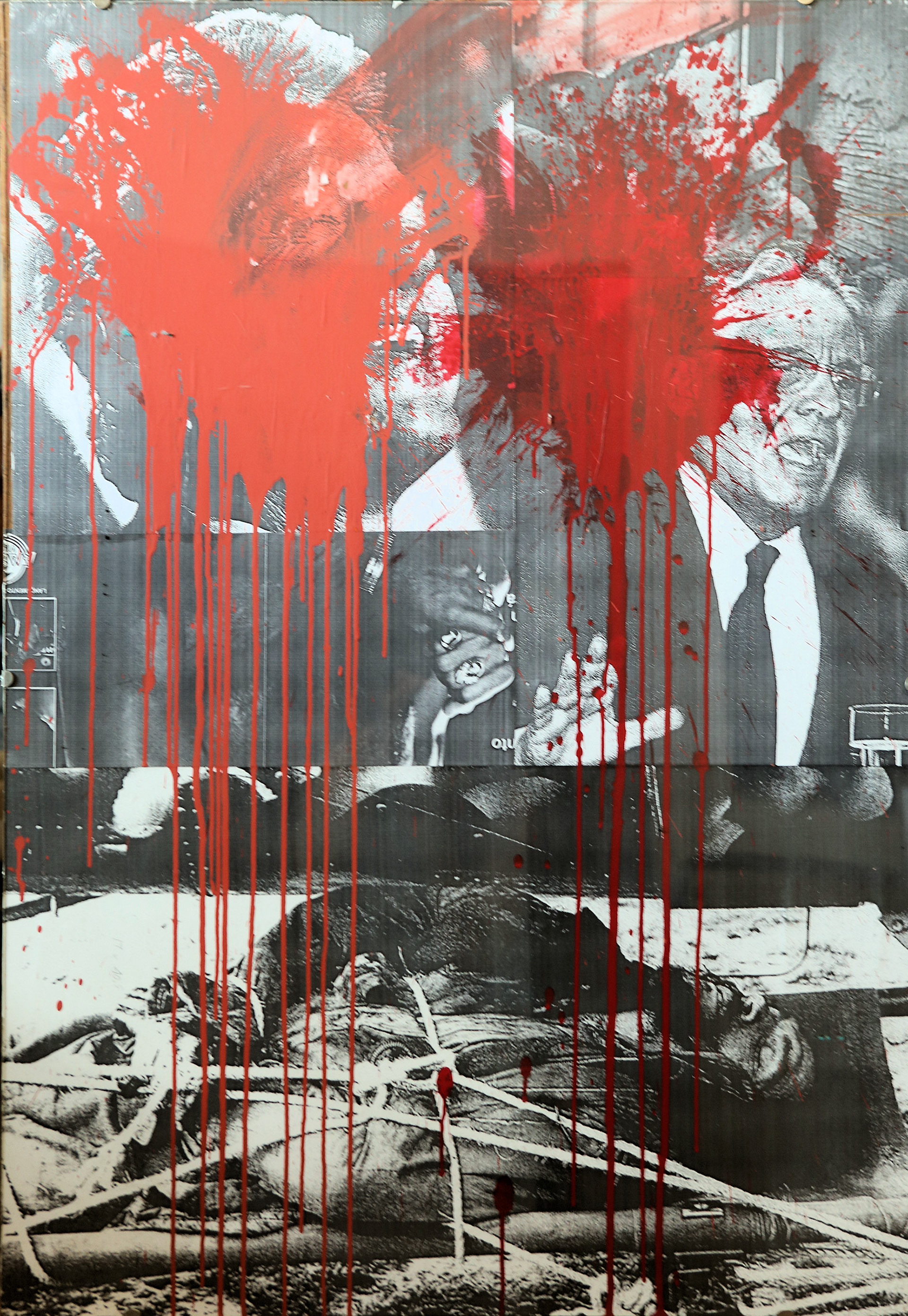 n.260 "Basta!" Asphalt, photo collage and oil on canvas. Year:2005. 150 x 200cm