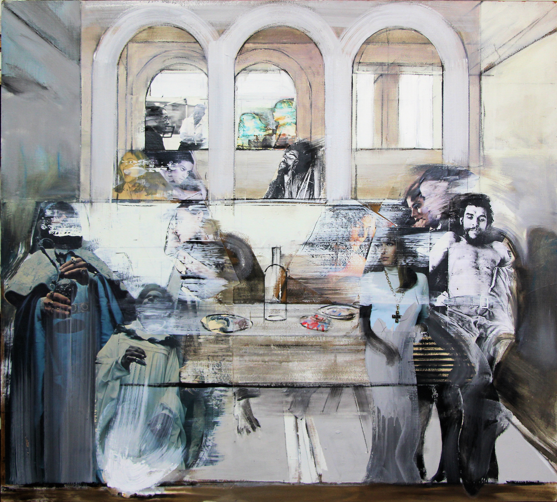 n.285 "O Festim de Donatello" Acrylic, asphalt and photo collage on canvas. Year:2007 156 x 136cm